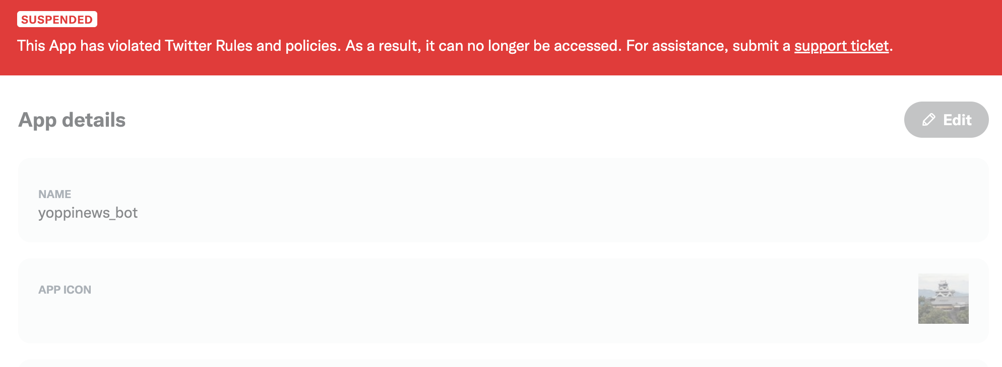 2019年3月9日より声優・青山吉能さんに関連したツイートを自動的に検出しリツイートする機能などを @yoppinews bot として稼働させていましたが、この度 2023年4月6日に bot の継続運用に必要不可欠である API キーがTwitter により無効化 されました(下記画像参照)。