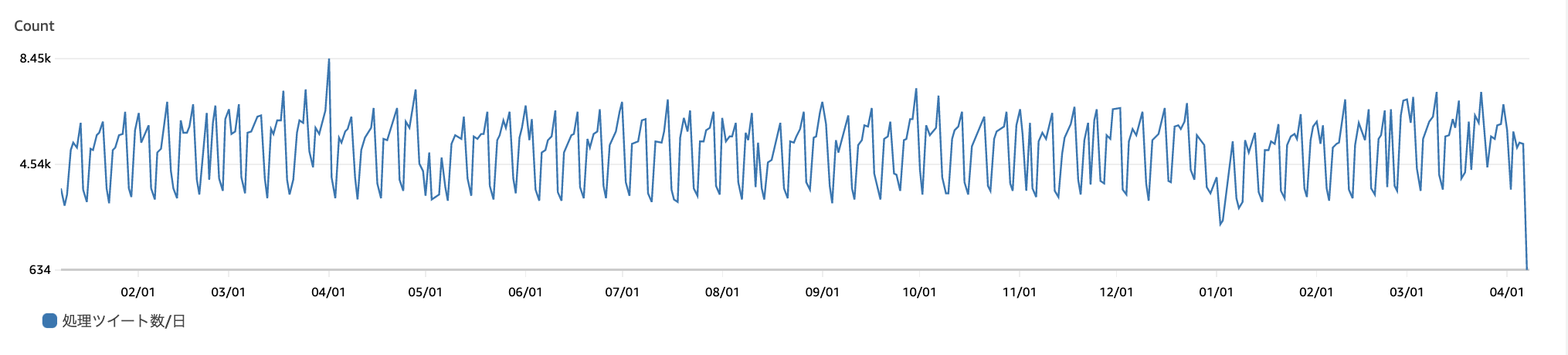 まずは検出対象のツイート数のグラフをご紹介します。下記グラフのように平日は 7,500 ツイート/日、土休日などは 3,500 ツイート/日程度のツイートの本文に対するキーワードマッチや関連画像検出を行っていました。こりゃ Twitter も怒って API キーを無効化しますね!(真顔)